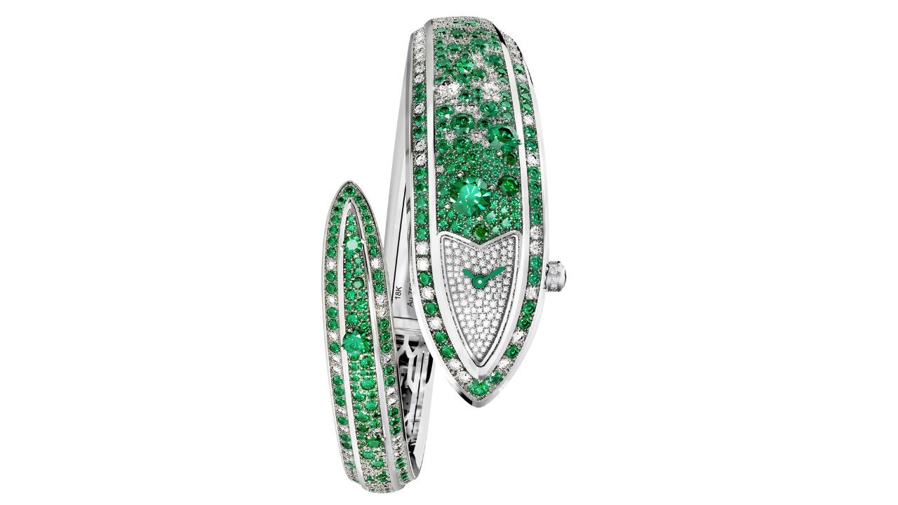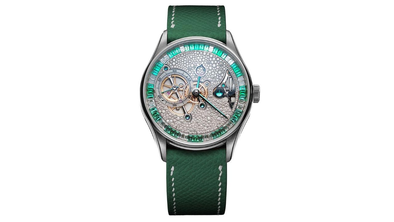 اگرچه این اثر از کاربندی سنتیتری از سنگهای قیمتی بهره میبرد، با ردیفی از سنگهای باگت در حاشیه طوقه و صفحهای مفروش (پاوه) با ۳۰۰ الماس ؛اما امتیاز اصلی آن در بیطرفی جنسیتی است. سایمون برت، یک ساعتساز مستقل و تازهکار است که آثارش عمدتاً مورد استقبال کلکسیونرهای مرد قرار گرفته است. این مدل ۳۹ میلیمتری با یک ساعت مکانیکی دستکوکِ کاملاً صنعتگریشده آغاز میشود که خود برای علاقهمندان به مکانیک، جذابیتی ویژه دارد. در اینجا، این مکانیزم درون قابی قرار گرفته که به همراه صفحه، حدود ۳ قیراط زمرد و الماس را در خود جای داده است. این اثر میتواند یک ساعت جواهرنشان برای کلکسیونرهای مذکری باشد که جسارت فراتر رفتن از زیورآلات معمولی را دارند، یا برای بانوان علاقهمند به مکانیزمهای پیچیده که به چیزی فراتر از تزئینات مرسوم ساعتهای مستقل نیاز دارند. در هر دو صورت، این اثر به خوبی عملکردی موفق دارد.